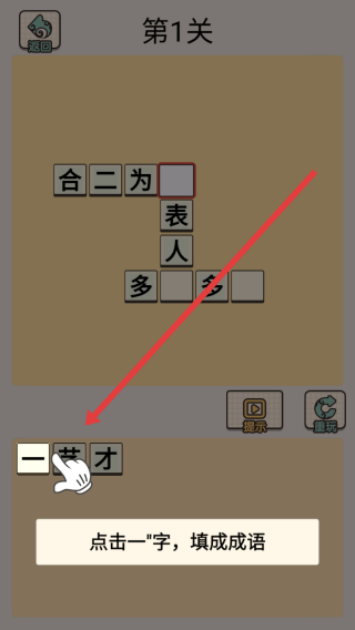 1、在第1关游戏界面,观察到“合二为”的成语结构,点击下方“一”字,将其填入空格,完成“合二为一”这个成语,这是利用对常见成语的记忆,精准匹配缺失字。