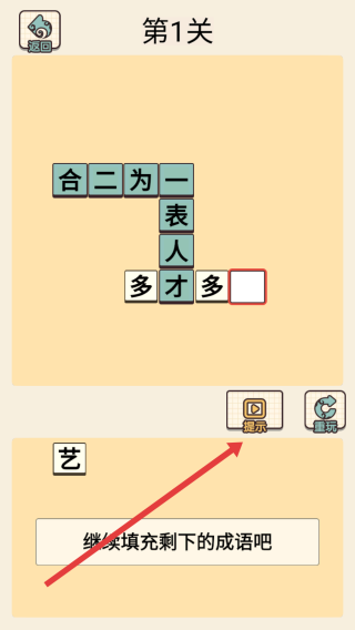 2、接着看“多才多”,下方出现“艺”字,可直接拖动“艺”字填入,完成“多才多艺”;若不确定,点击界面右侧【提示】按钮,借助线索辅助填字,逐步完成剩余成语的填充。