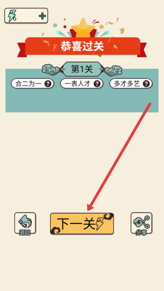 3、当所有成语(都正确填写后,界面显示“恭喜过关”,此时点击【下一关】按钮,即可进入新的成语关卡,持续挑战不同成语,在游戏过程中积累词汇量。