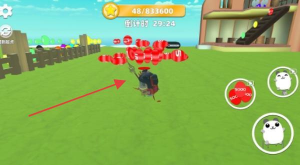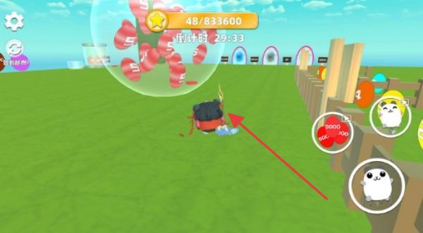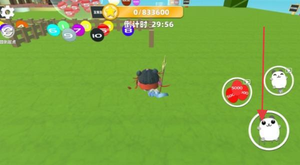 2、点击右侧箭头指向的白色宠物图标,召唤宠物协助,同步收集场景中的数字球与道具,提升收集效率。