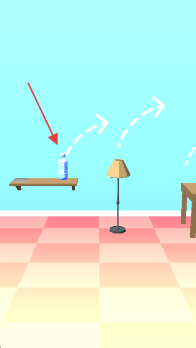 1、在室内场景中,点击木质桌面上的蓝色水瓶,借助预设的抛物线轨迹(白色虚线指引),启动水瓶的弹射动作。