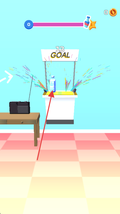 2、把控水瓶飞行路径,使其沿轨迹精准落入标有“13GOAL”的白色目标台,触发彩色喷溅特效,完成投递任务。