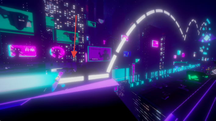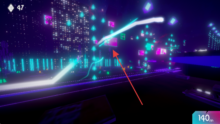 2、操控角色在赛博朋克城市赛道奔跑,跨越霓虹拱门等地形,保持前进。