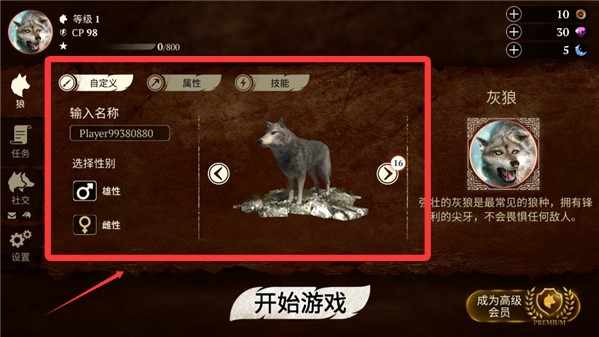 2、然后自定义狼的毛色与强化属性,再点击开始游戏。