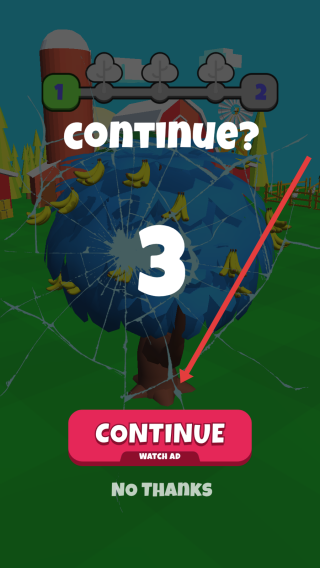 3、失败后,在“continue?”界面,点击【CONTINUE】看广告复活,或选【No-THANKS】重新开局,继续农场采摘挑战。