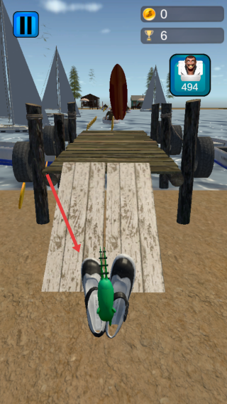 2、场景推进:操控绿色滑行器,沿码头、水面路径前进,收集金币。