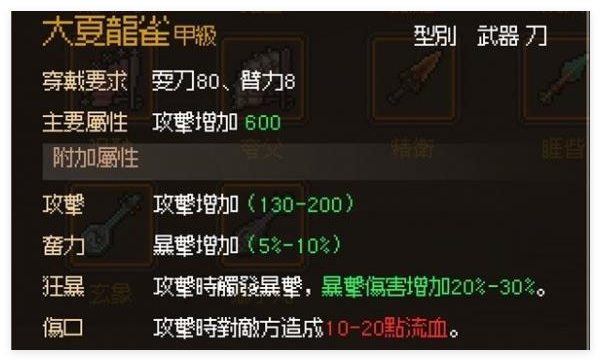 2、大夏龍雀定位:甲级刀类武器,需求“耍刀80智力8”,主打“暴击爆发+持续流血”,附加属性(攻击、蓄力加成)提升输出上限。