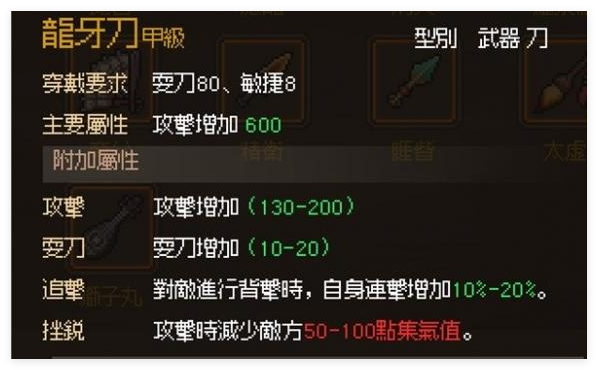 1、龍牙刀定位:甲级刀类武器,需求“耍刀80+敏捷8,主打“背击连击+集气干扰”,附加属性(攻击、耍刀加成)强化输出基础。