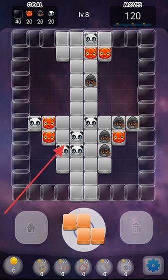 2、在关卡界面,观察目标与步数限制,拖动方块到合适位置,组合相同图案消除。
