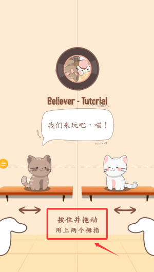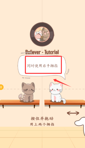 2、双手拇指按住屏幕拖动,与两只猫咪互动完成教学。
