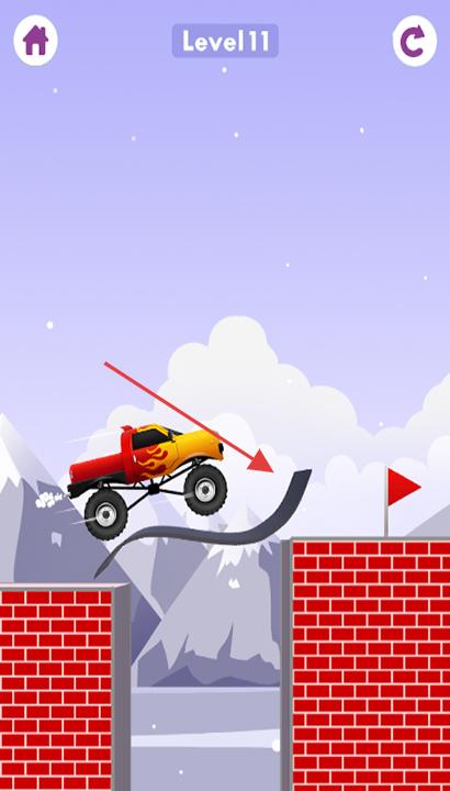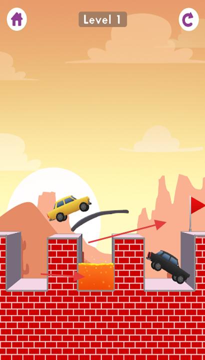 2、释放汽车,借助搭建的道路,利用物理惯性、弹跳,让汽车行驶至终点,完成关卡。