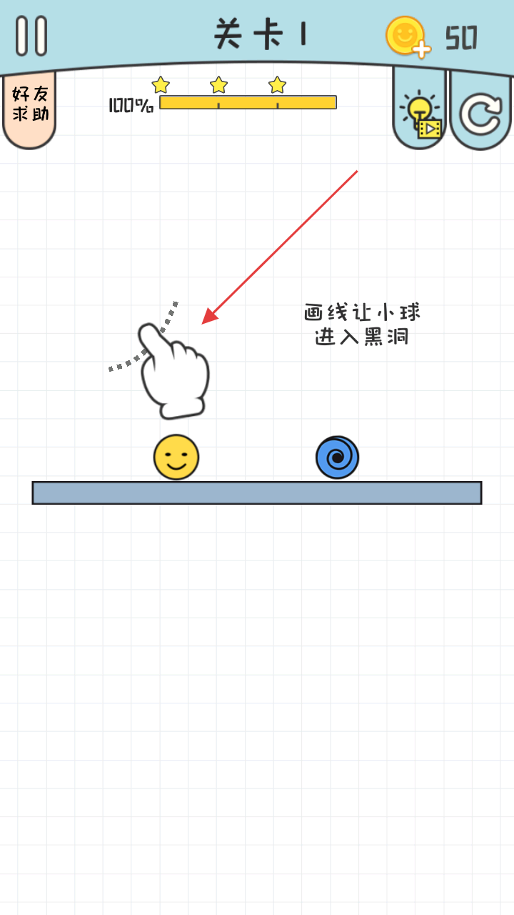 1、画笔规划线路引导:通过画笔画出黑线,为小球设计移动路径,利用线条的角度与长度控制小球滚动方向,避开障碍,精准引导至黑洞位置,完成关卡目标。
