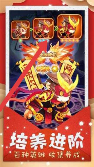 1、进入游戏,参与“培养进阶”玩法,收集英雄,消耗材料让英雄升星(如箭头指向的进阶流程),提升战力。