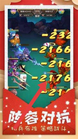 2、在“阵容对抗”模式,搭配英雄阵容,利用技能、属性克制,在战斗中输出伤害(参考箭头指向的战斗数值),赢取胜利。
