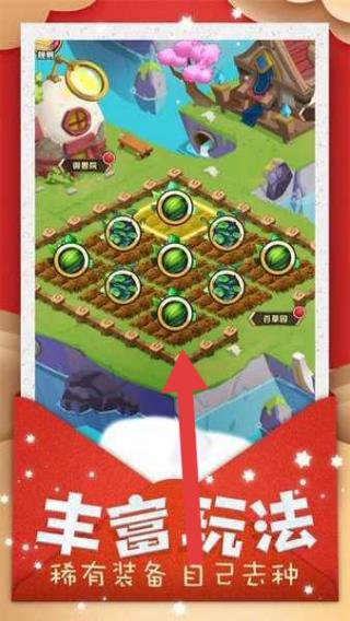 3、体验“丰富玩法”的农场模块,种植稀有装备种子(按箭头指引操作),收获后强化角色,拓展游戏养成线。