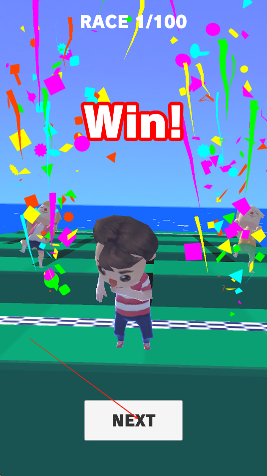 3、率先冲过终点线即可获胜,途中可收集加速道具提升奔跑速度,或触发弹跳板跨越超长距离,通过不断挑战高难度关卡提升操作技巧,解锁更多趣味皮肤与场景。