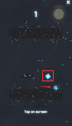 2、点击屏幕操控飞船,触碰蓝色方块完成第一关目标。