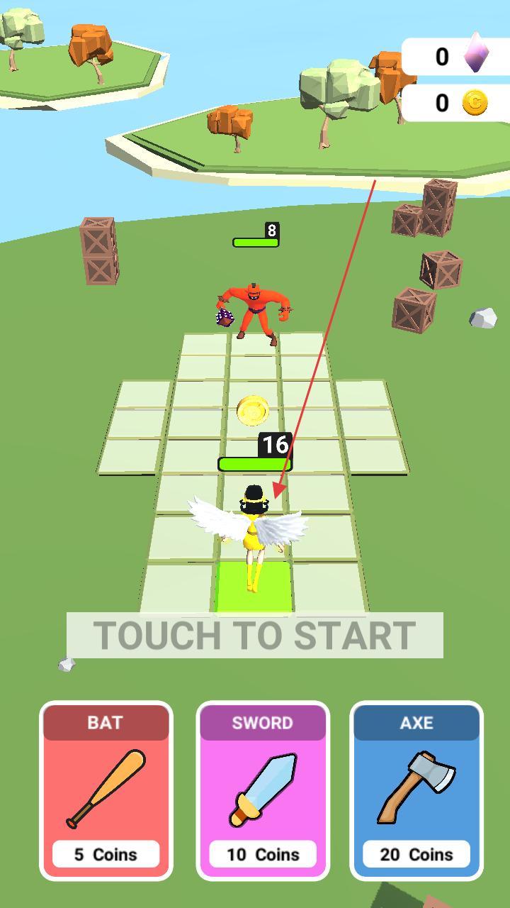 1、开局选武器(BAT/SWORD/AXE),点击“TOUCHTOSTART”,操控角色移动战斗。