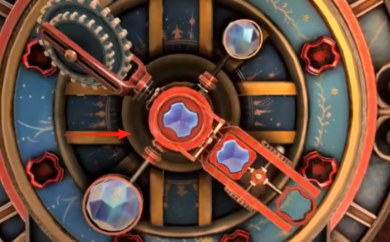 1、观察齿轮机关(红箭头),旋转部件,使蓝色水晶对齐,解锁第一步。