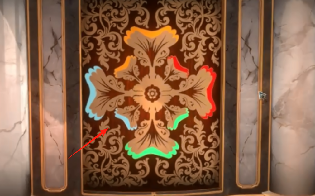 2、对照花纹门颜色(蓝、橙、红、绿),调整机关对应颜色,打开门。