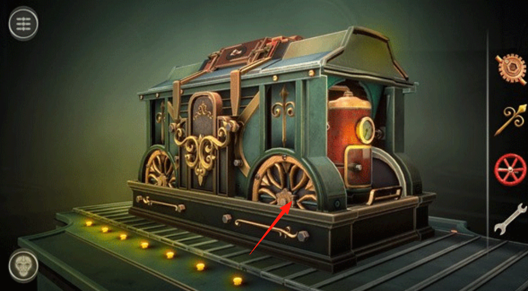 3、检查蒸汽火车(红箭头),用右侧工具(扳手/齿轮)修复车轮,推进解谜。