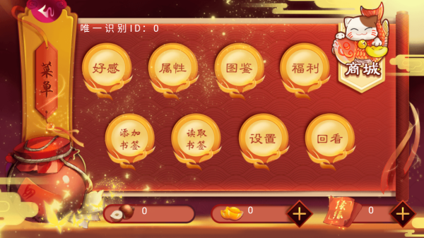 3、用【添加书签】【读取书签】管理进度,【设置】调参数;借【好感】【属性】了解状态,【图鉴】【福利】【回看】辅助游玩,【商城】购道具,优化体验。
