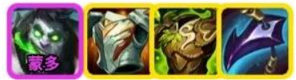 主坦蒙多:狂徒(提供高额生命值与回血)、板甲(减少普攻伤害)、龙牙(抵抗法术伤害),三件套提升蒙多生存能力,确保前排承伤。