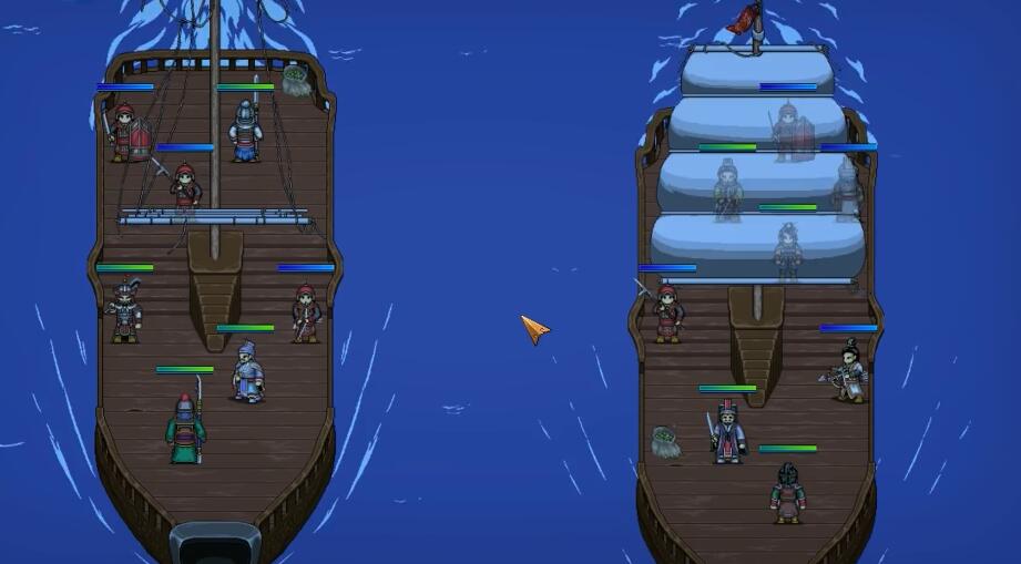 1、场景叙事:草地(野战)、舰船(水战)场景差异化设计,环境风格(开阔/狭窄)塑造战斗节奏(野战拉扯、舰船接舷),强化场景沉浸。