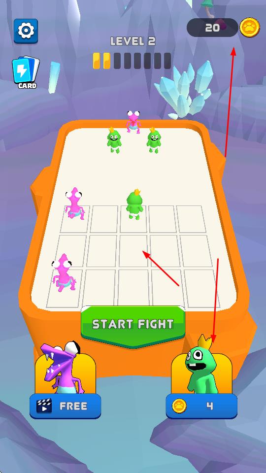 2、消耗金币,购买、召唤同色怪兽,与棋盘上已有同色怪兽合并,提升等级、战力。