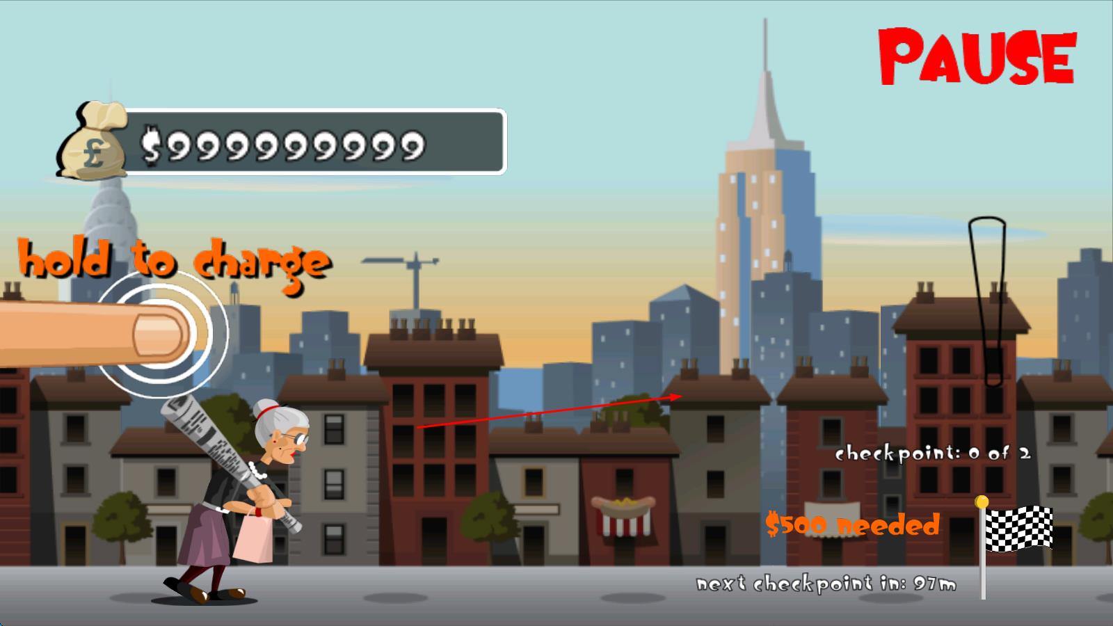 1、踏入游戏,老奶奶延续前作的愤怒,即刻奔赴世界各地,开启敲打路人之旅,手指长按可蓄力,从路人身上打出更多金钱。