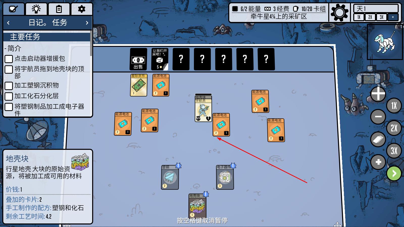 1、卡牌收集建造:购买补充包收集卡牌,通过堆叠组合触发配方,建造太空站、无人机等设施,发展星际基地。