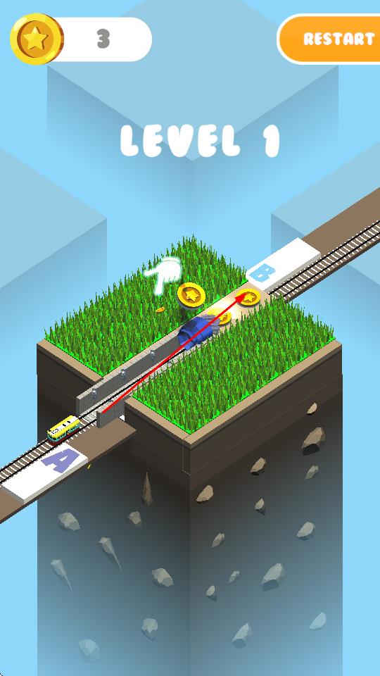 1、在关卡场景,长按或拖动屏幕,挖掘地下轨道,为蓝色车辆规划从起点到终点的通行路径。