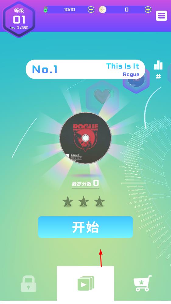 1、下载进入游戏后,点击开始按钮,在海量原创音乐中选择心仪曲目,开启旋转节奏挑战。