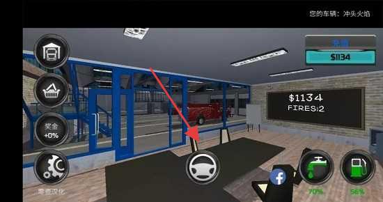 1、车库内点击方向盘图标,启动【消防车模拟】游戏。