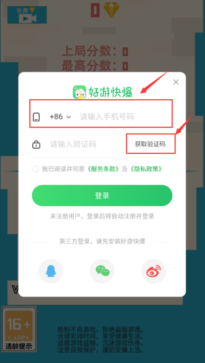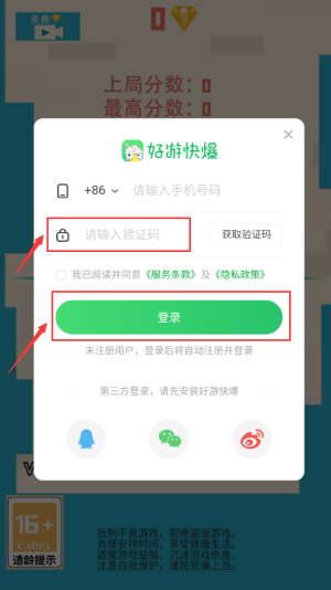 2、输入手机号获取验证码,勾选协议后点击绿色登录按钮。