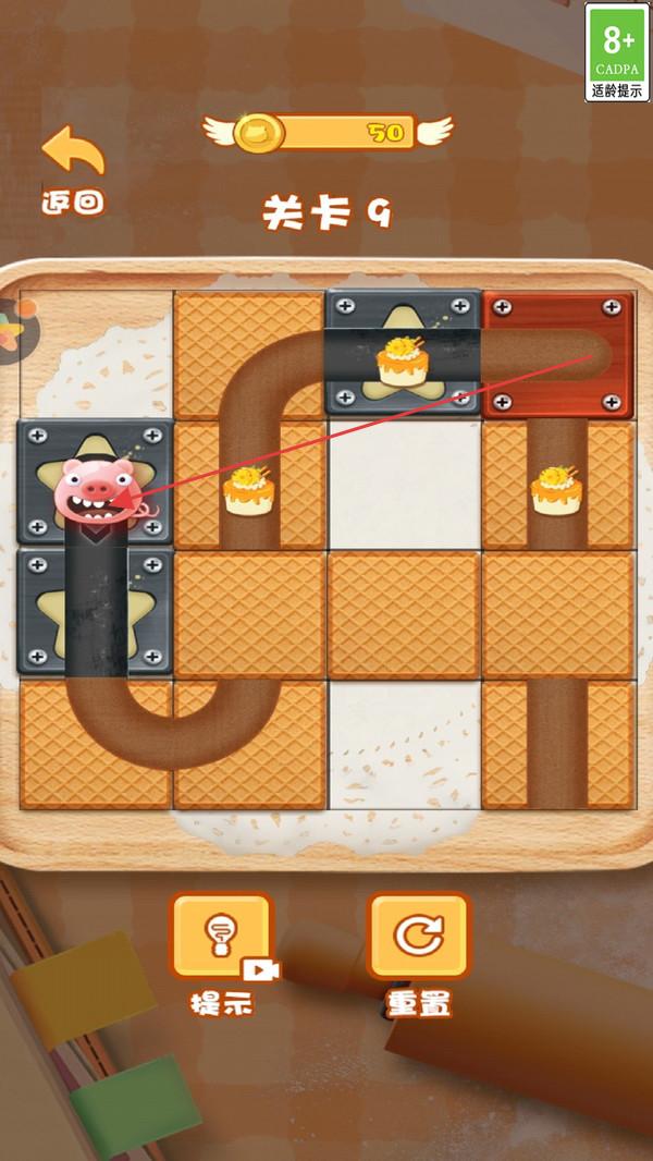 2、让管道连通小猪与蛋糕,引导小猪吃到蛋糕,完成关卡挑战。