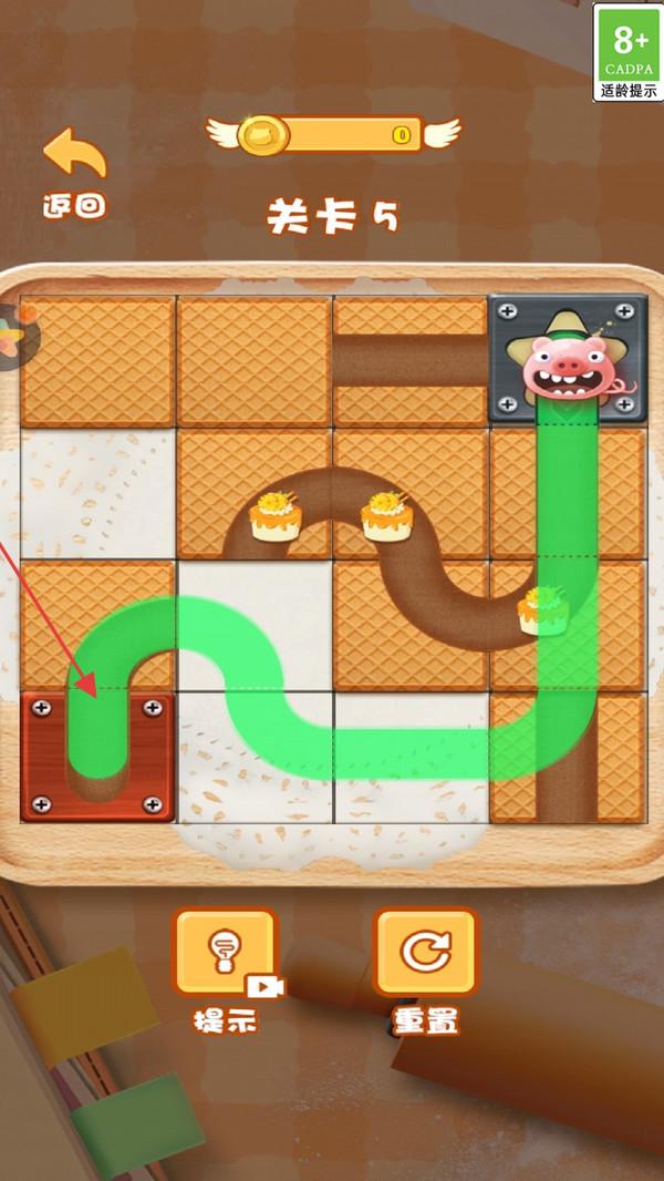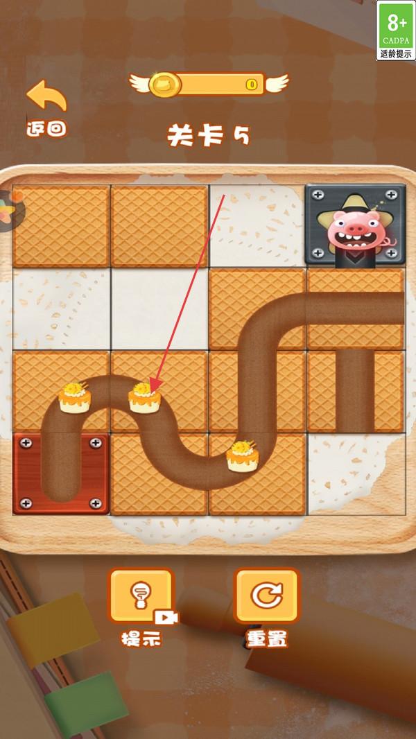 1、进入关卡(如关卡5、9),观察管道碎片布局与蛋糕位置,拖动碎片拼接完整管道。