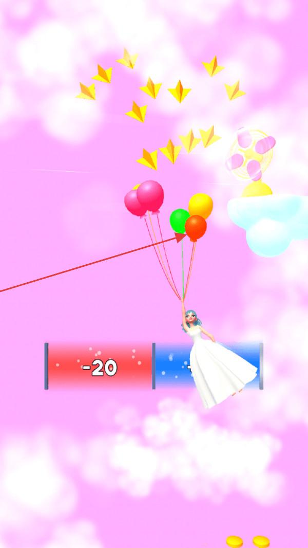 1、操控角色(婚纱女孩)在LEVEL3等关卡,让气球群穿过带有数值(如X50、-40)的通道。