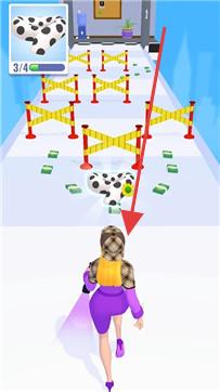 1、操控角色(紫色装扮人物)在跑道上前进,收集目标物品(奶牛、彩色布条、心形)。