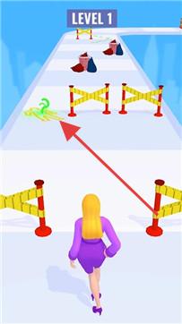 2、躲避黄色路障等障碍,按箭头指引方向,沿跑道移动,完成“LEVEL1”等关卡。