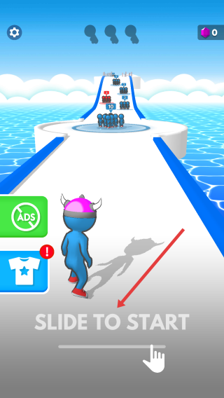 1、开局启动:滑动屏幕“SLIDE TO START”,操控蓝色小人开启Level1挑战。