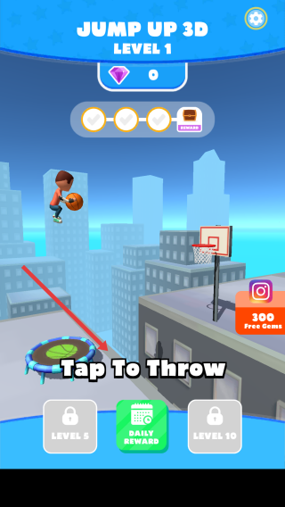 1、关卡开局:进入Level1,角色立于蹦床,依据“Tap To Throw”提示,准备投篮挑战。