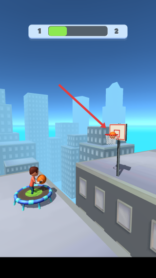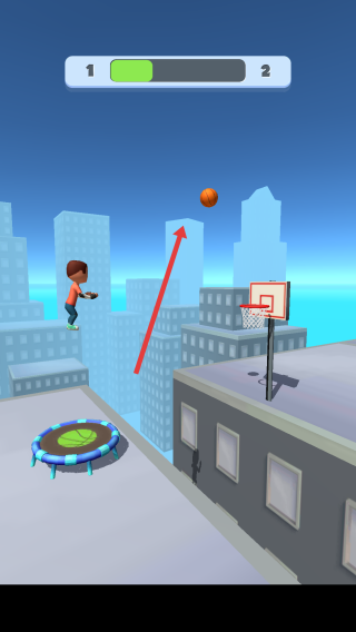 2、投篮操作:点击屏幕,操控篮球借蹦床弹力升空,调整轨迹瞄准篮筐。