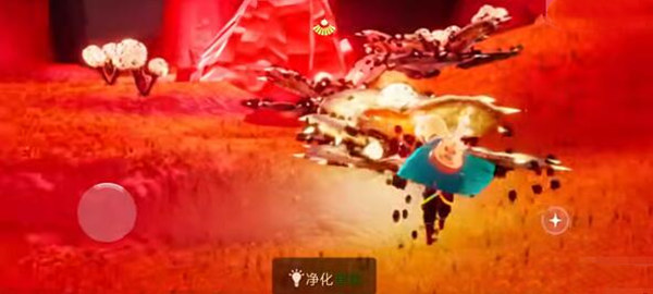 3、环境交互:场景地形(红色植被、水晶地貌)影响探索路径,互动元素(净化操作、能量收集)与冒险操作深度互动,增强沉浸感。