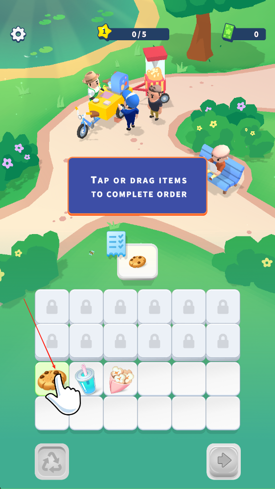 1、进入游戏后点击开始营业,在点餐界面查看顾客需求,滑动屏幕连线三个以上相同食材方块,消除后即可制作对应美食完成订单。
