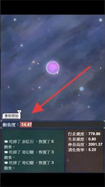 2、发现紫色星球目标,调整移动方向,让自身星球与之接触,吞噬后积累进化所需的进度。