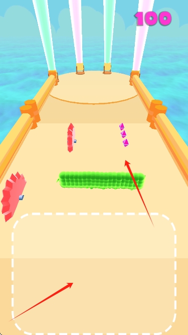 2、遇到带旋转刀片的窄道,快速绘制流线型物体,贴合通道形状穿过危险区域。
