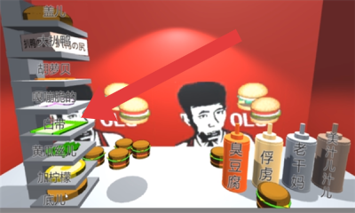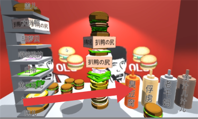 3、堆叠多层后,选“臭豆腐”配料,提升汉堡特色,完成搞怪汉堡创作,解锁新玩法。