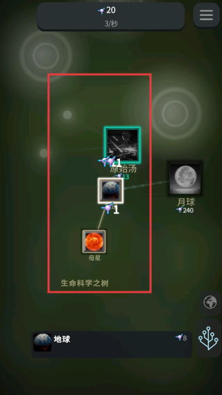 3、在已选星球的关联界面,关注【生命科学之树】体系,依据指引连接、发展相关节点,推动星球生命演化进程。