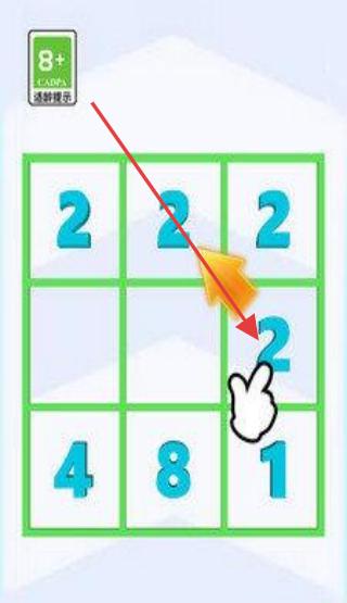 3、进入方格界面,按照指引点击数字方块(如箭头指向的2),通过合并相同数字,获取更高数值方块,积累分数。